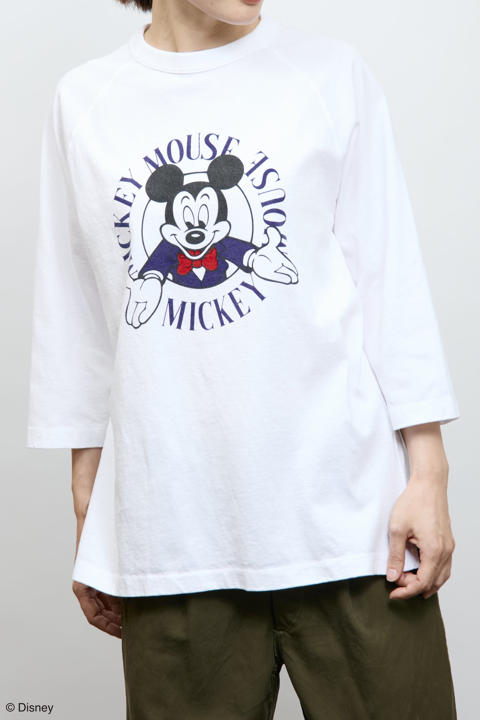 ミッキーマウスデザインのラグランスリーブ7分袖カットソー。