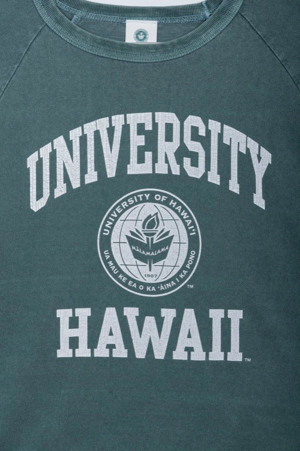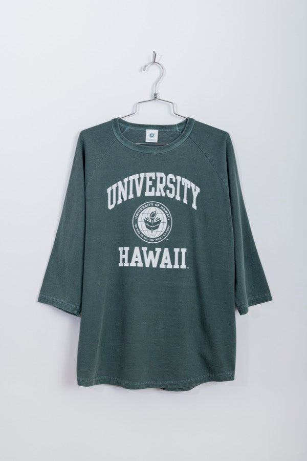 アメリカの名門校「ハワイ大学」のオフィシャルTシャツ。顔料染めされたラグラン7分そでが心地よいヴィンテージ感を演出してくれます。