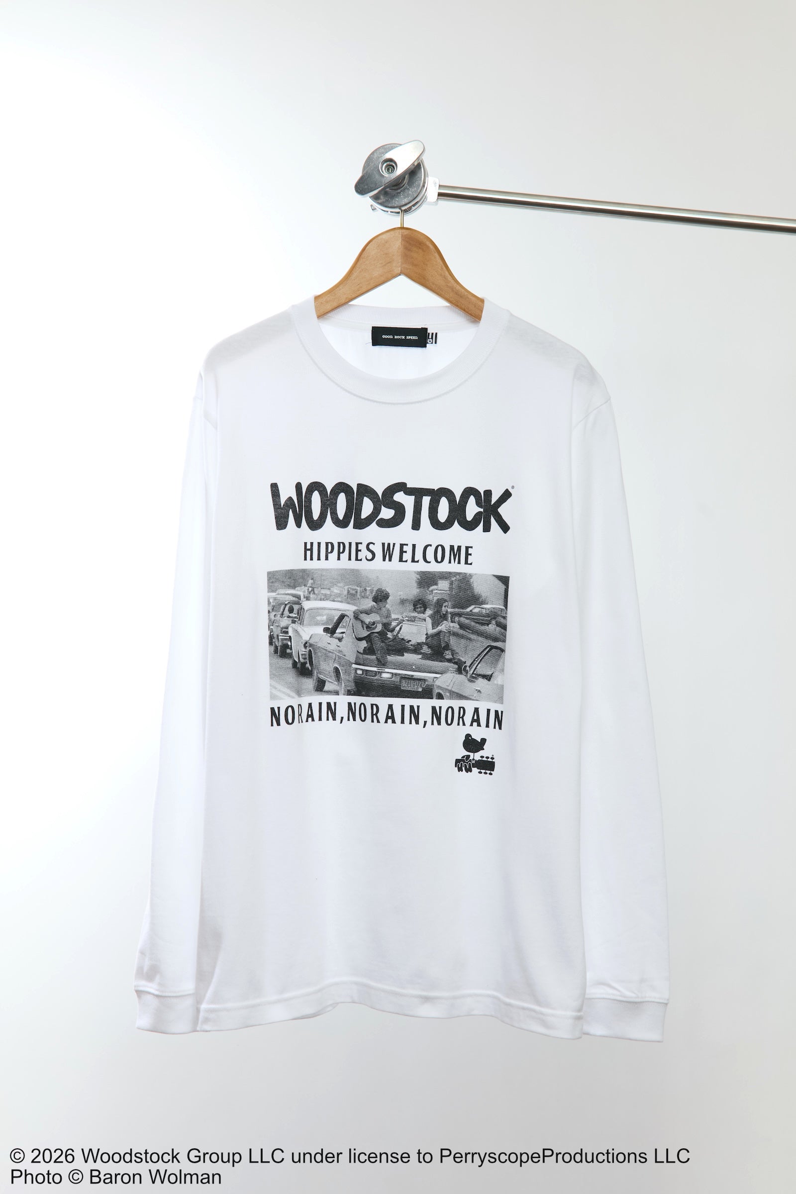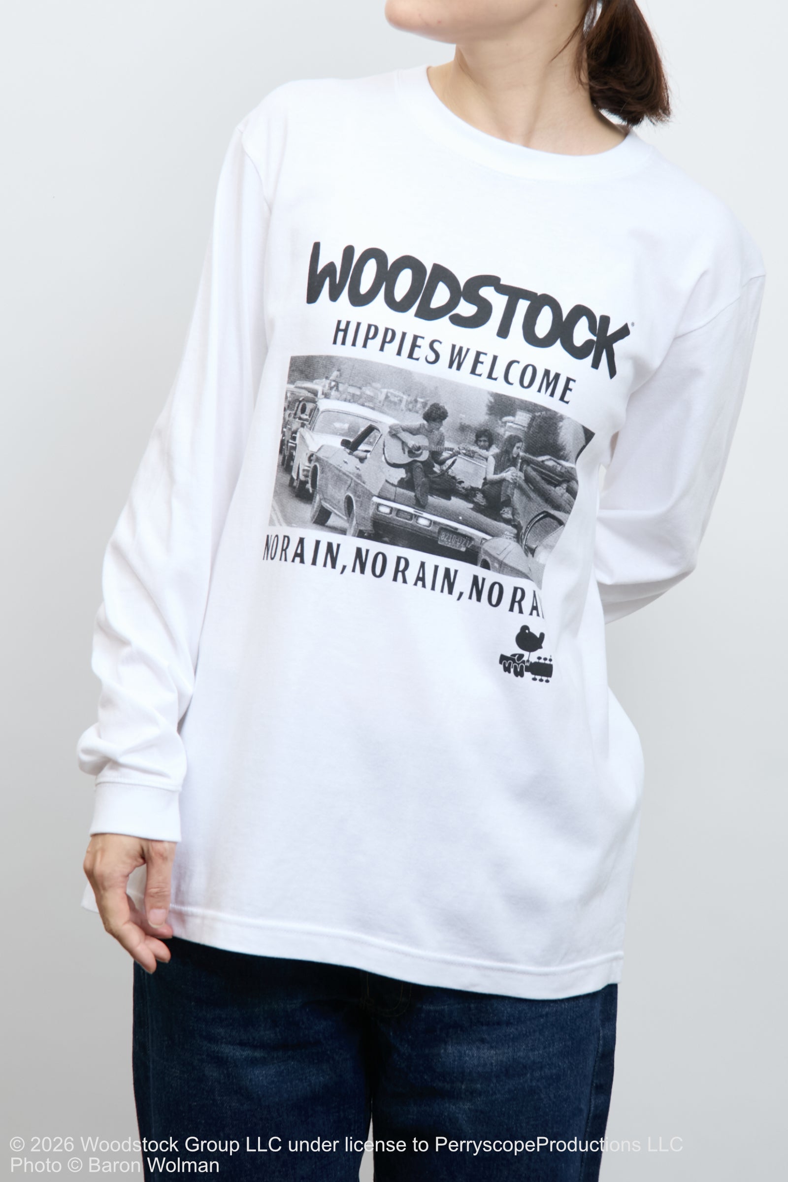 1969年の伝説的なウッドストック音楽祭を象徴するフォトをあしらったロングスリーブTシャツ。